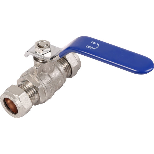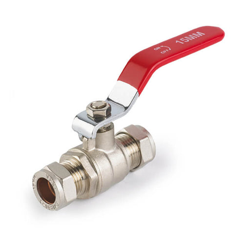 Full bore compression ball valve. Plated brass body with a red handle. Suitable for water and compressed air applications up to 85°C.