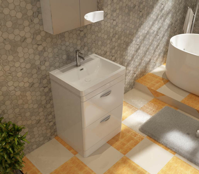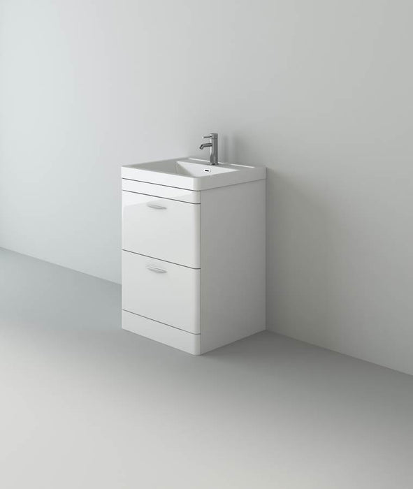 Floorstanding vanity unit 600mm white gloss finish with double drawers.