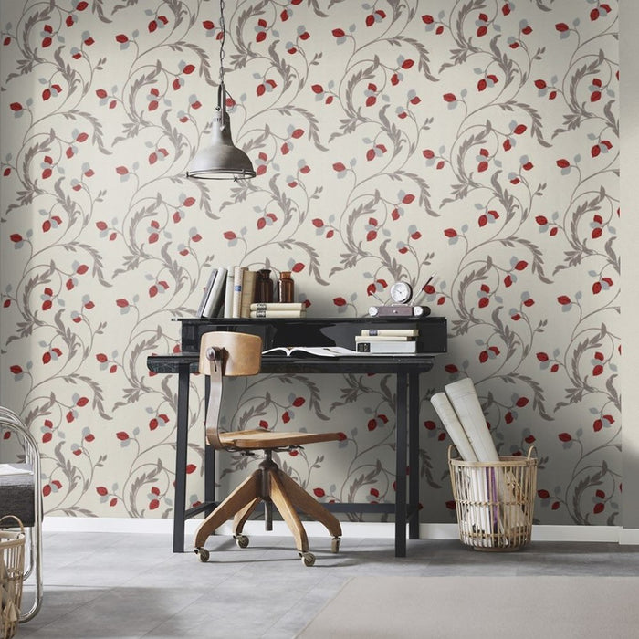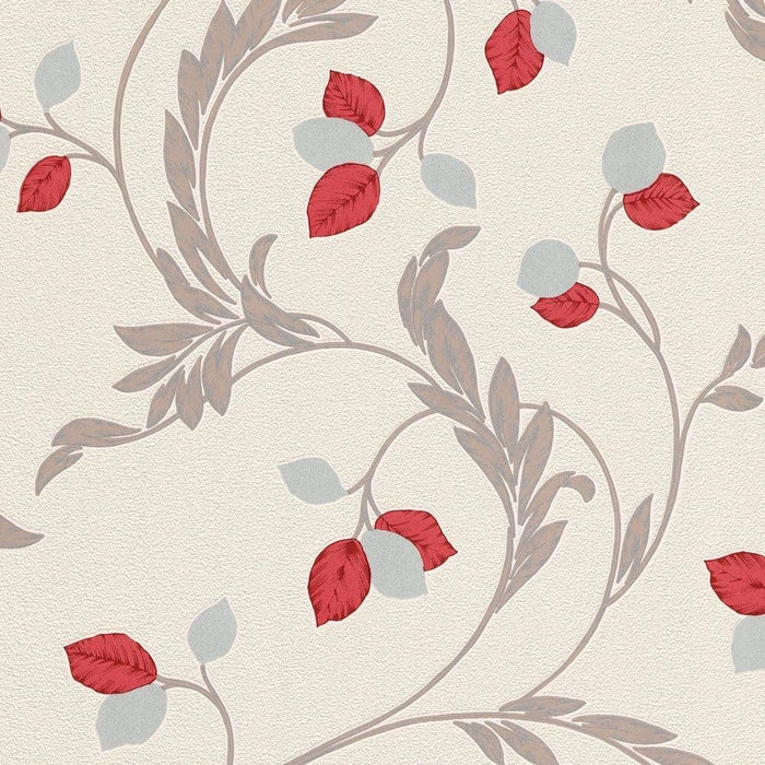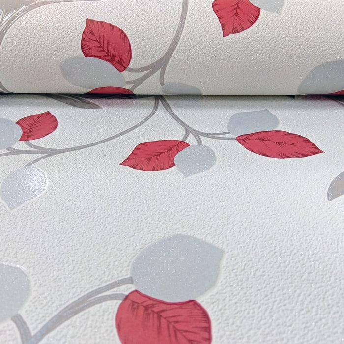 This modern wallpaper features a traditional climbing leaf pattern, textured for effect, and with an off-white background and red leaves infused with sparkling glitter.