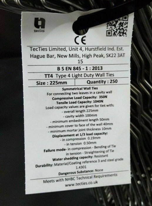 TecTies Light Duty Wall Ties 225 mm, 250 Pieces Stainless Steel TT4 Type 4 Symmetrical Wall Ties. For connecting two leaves in a cavity wall.