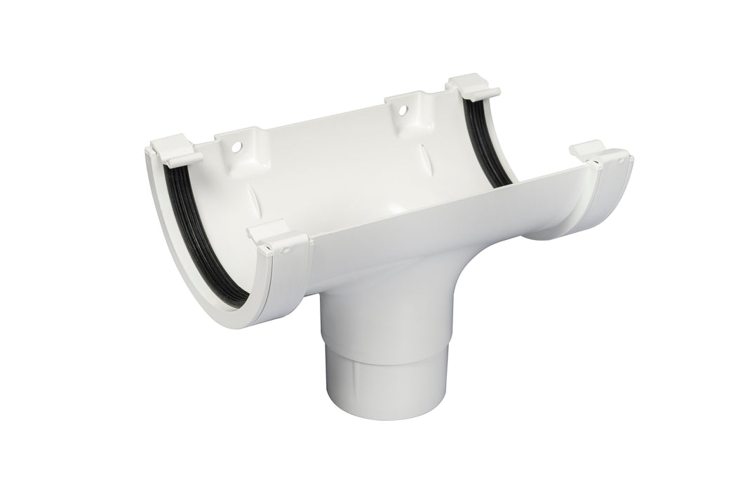 Running outlet for gutter and downpipe connection. Available in black and white.