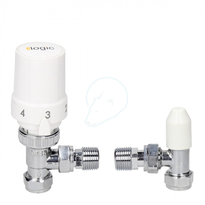This Logic 15mm TRV and lockshield twin pack consists of an angled thermostatic radiator valve and matching lockshield valve. A TRV regulates the fluid flow to the radiator to keep the ambient temperature of the room constant at the set value preventing unwanted temperature rises and achieving considerable energy savings.